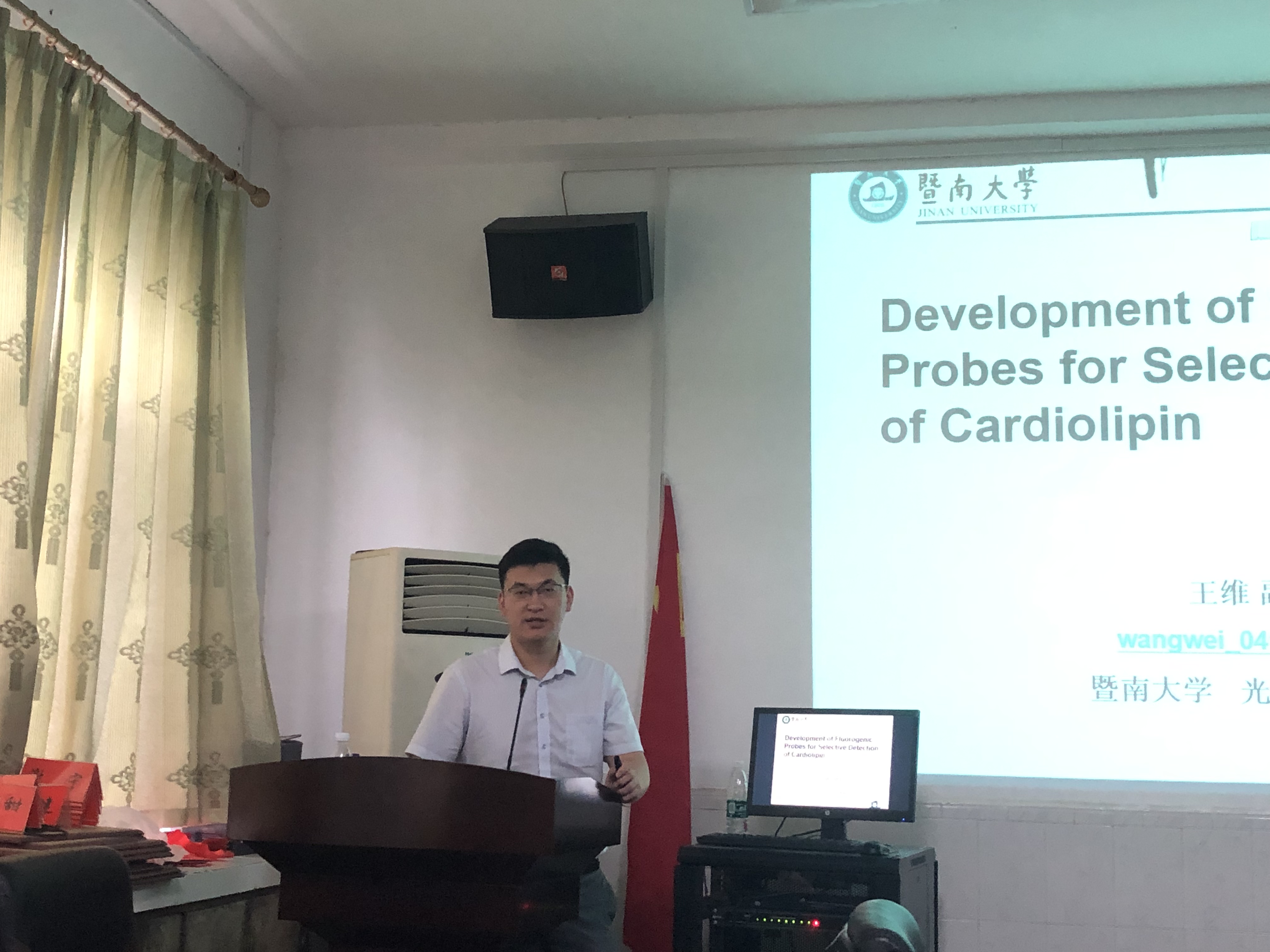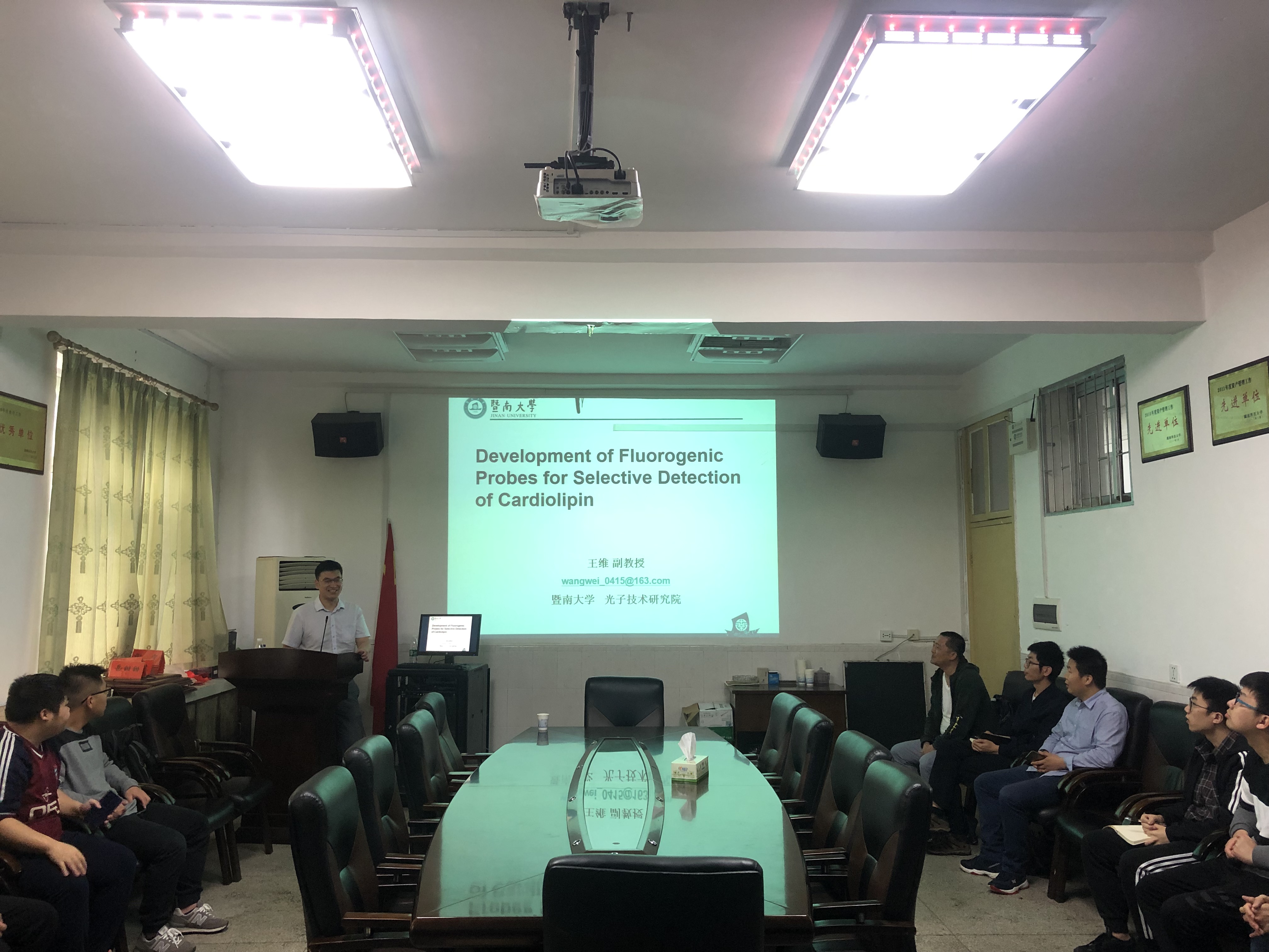 2019年5月17日上午10:00,暨南大学光子技术研究院王维副教授受邀莅临beat365官网于物理楼213作以“生物分子探针与光学诊疗”为主题的学术报告,院党委副书记杜鑫主持会议。