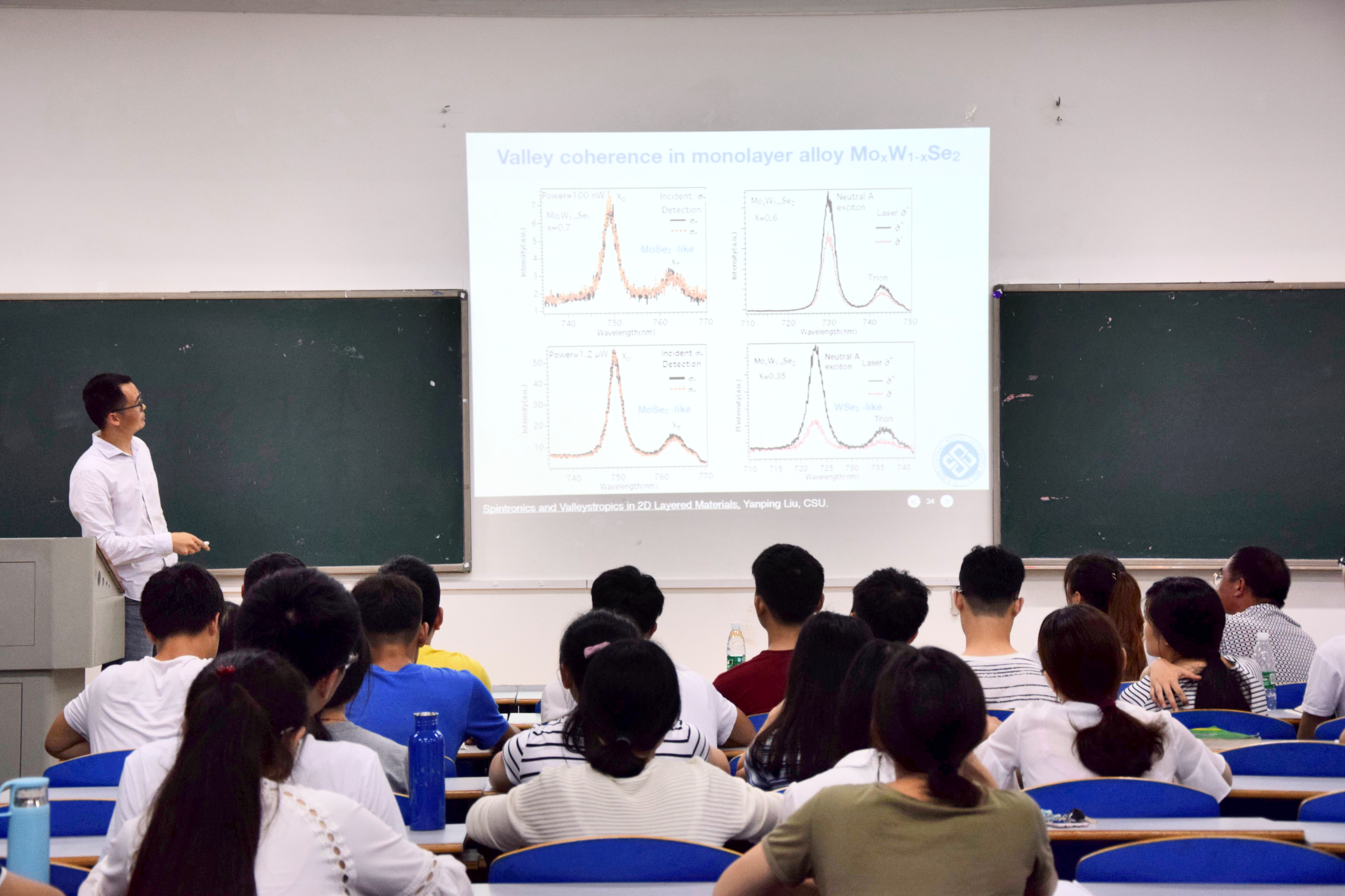 讲学开始,刘教授展示了基于二维层状材料自旋电子学和谷电子学的研究,他用精准与专业的知识让同学们看到了科学前沿领域的发展。紧接着,杨兵初教授向大家介绍了中南大学物理与电子学院的科研、实验、师资等方面的情况,同时向同学们分析了他们学院考研的基本情况。