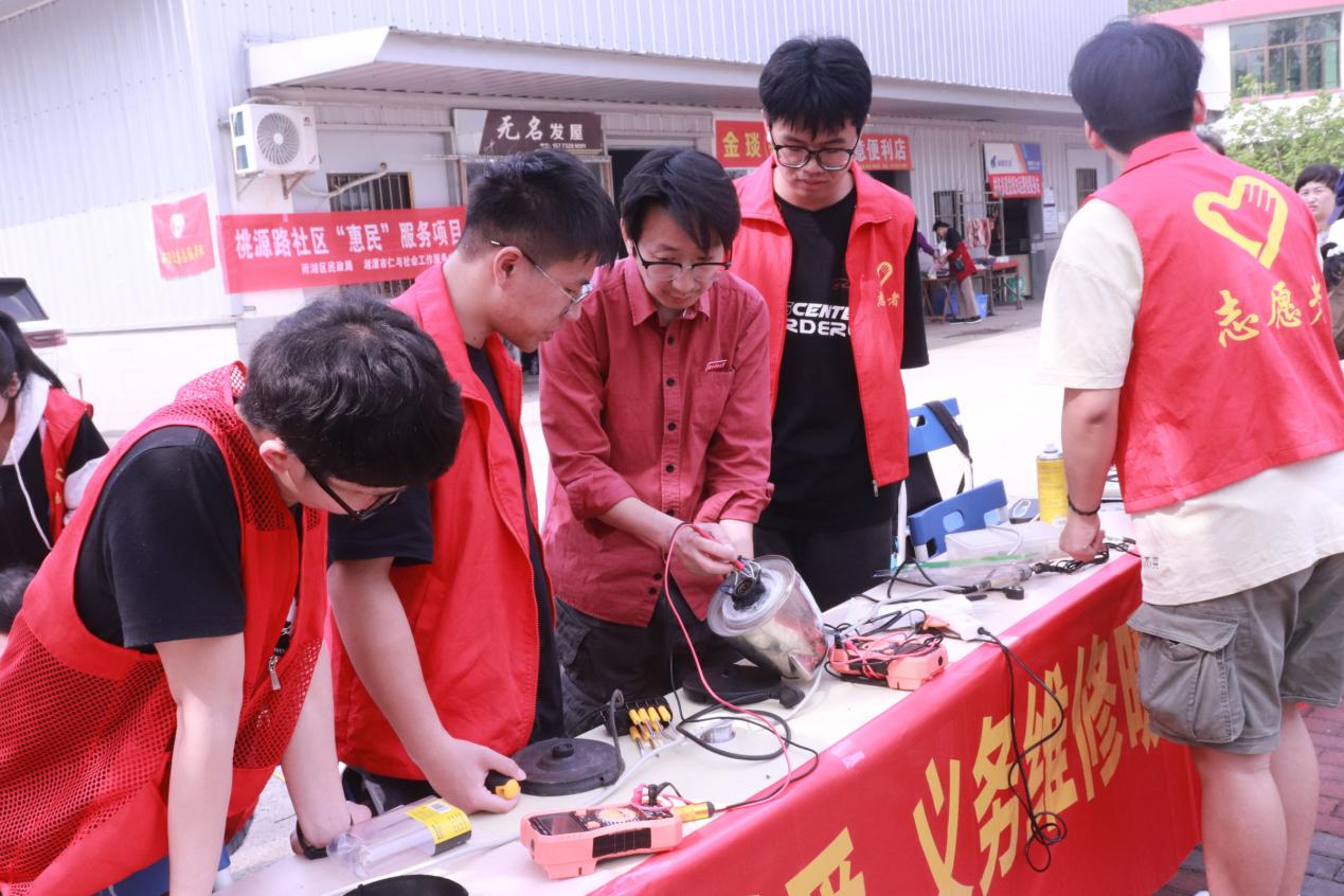为感恩回馈社会,发扬志愿精神,培养学生动手能力,beat365英国官方网站充分发挥学科特色与专业优势,于5月13日上午母亲节来临之际,走进万楼街道桃源路社区开展以“感恩母亲传递爱,义务维修暖人心”为主题的家用电器义务维修活动。活动由学院指导老师丰元带队,主要成员为学院信电协会的同学们,社区工作人员和志愿者。学院党委书记易贵元、党委副书记贺玲以及万楼街道党工委委员李伟蓉、桃源路社区书记杨闰萍到现场指导工作。